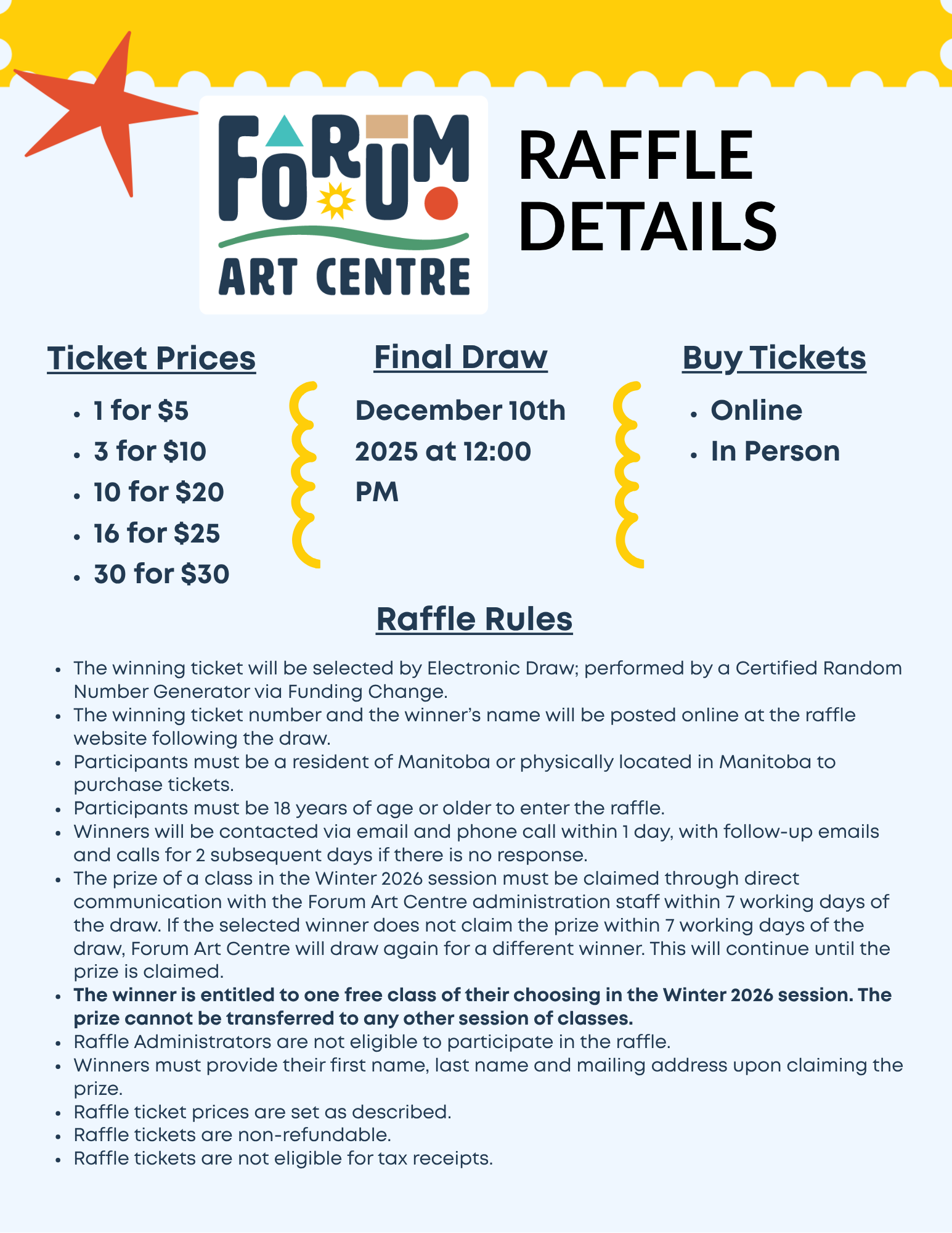 We're having a raffle! Enter to win a FREE art class of your choice in the Winter 2026 session.