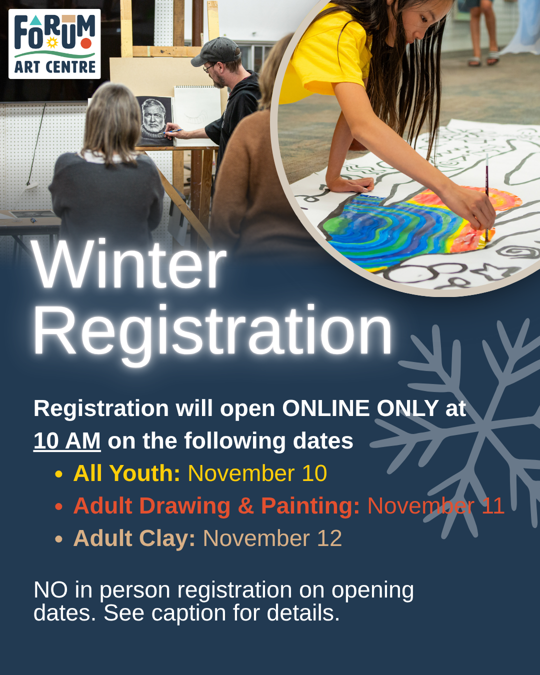 Want to enter the raffle, but don’t want to risk not getting a spot in the class of your choosing? No worries! Register for your class as normal when registration opens. If you win the raffle, Forum Art Centre will refund you the class fee you paid when you registered. Please note: to secure your registration payment must still be received within 48 hours. |
